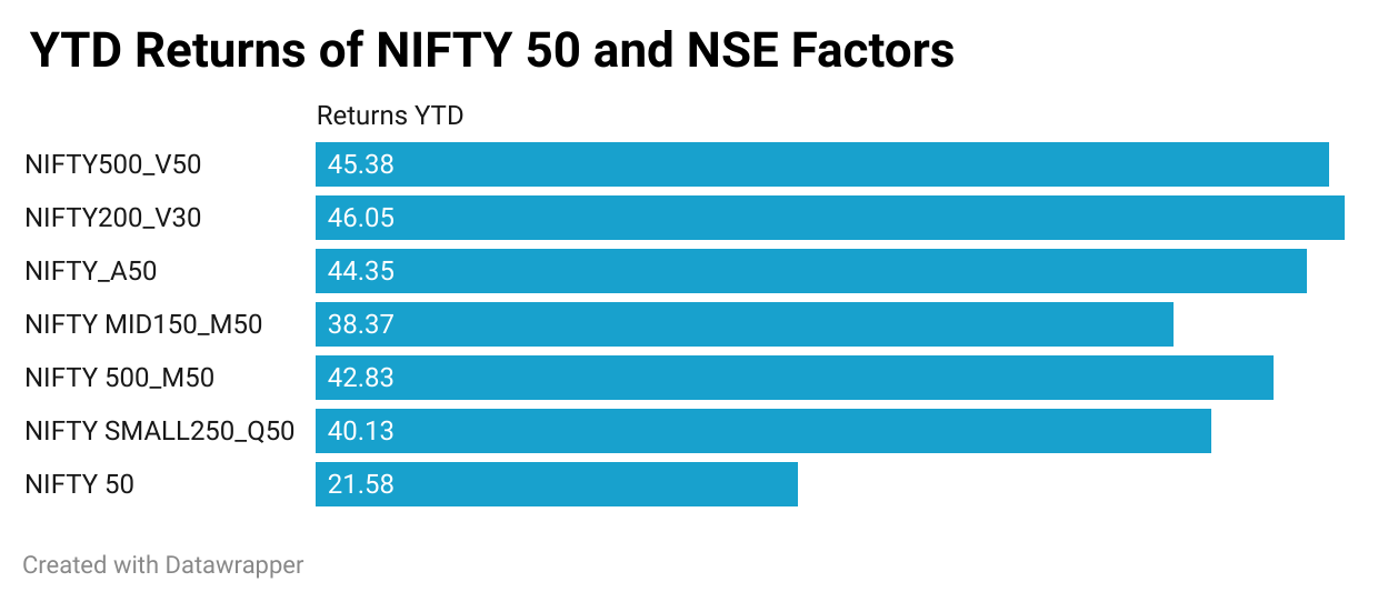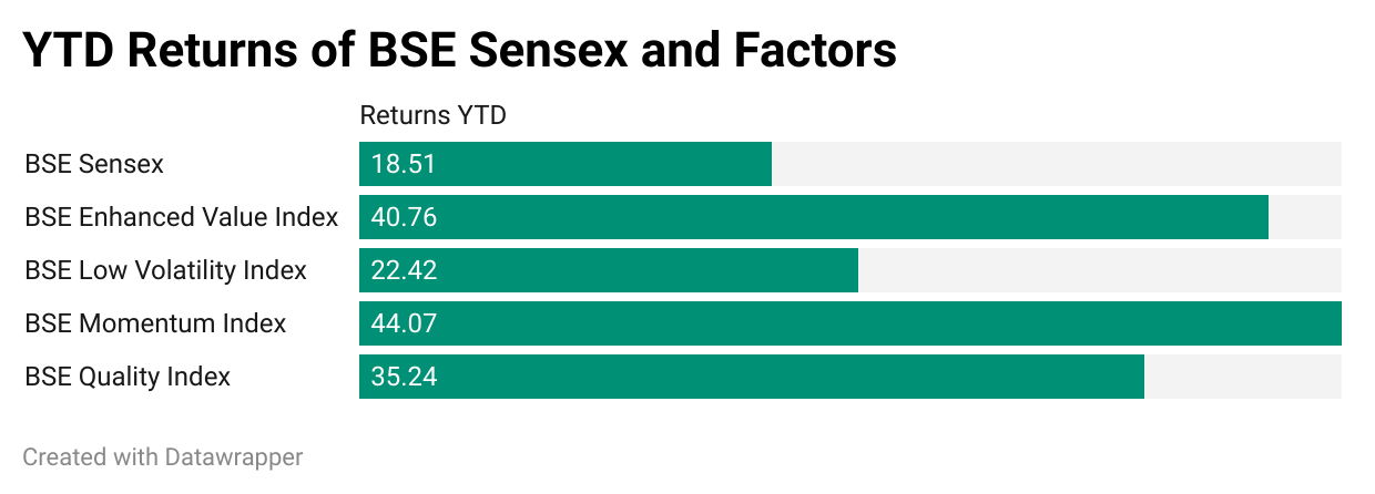 BSE Sensex lags other factors with lowest YTD return of 18.51%, suggesting factor-based strategies outperformed the broader market in this period
