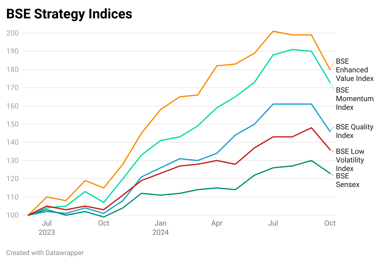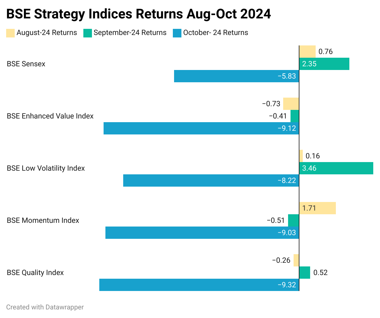 October 2024 saw a sharp market correction with all indices falling 5–9%, with BSE Quality Index being the worst hit (-9.32%)