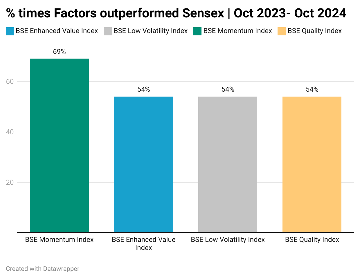 Performance vs. Benchmark: All factor indices outperformed the BSE Sensex on multiple occasions. Among these, the Momentum Index was the most consistent in outperforming the benchmark, while the other indices — Value, Low Volatility, and Quality — had similar success.