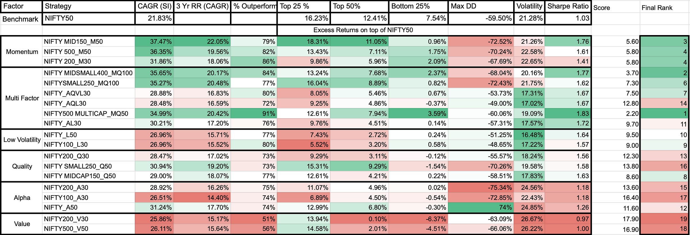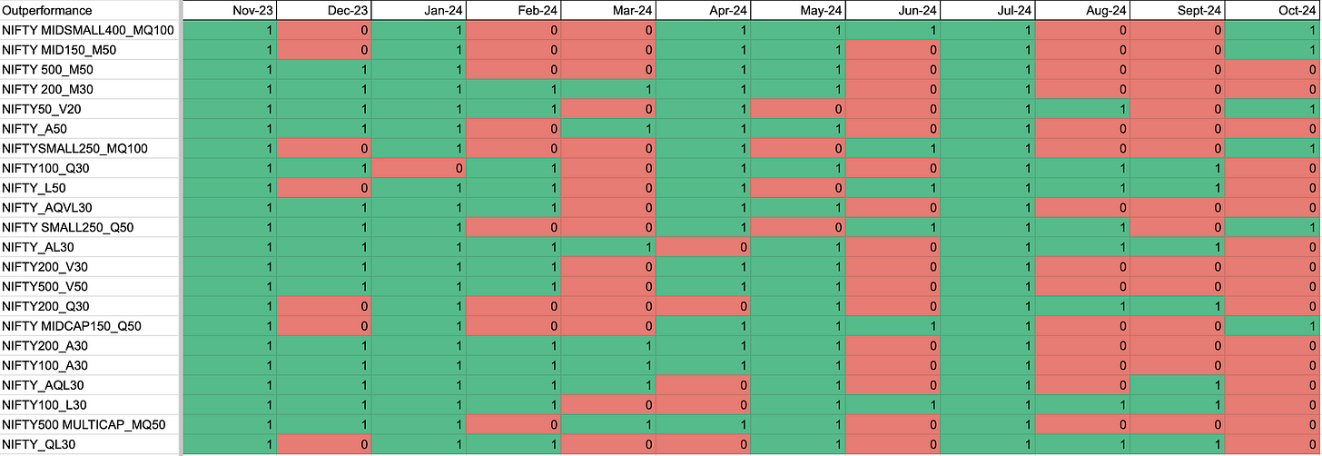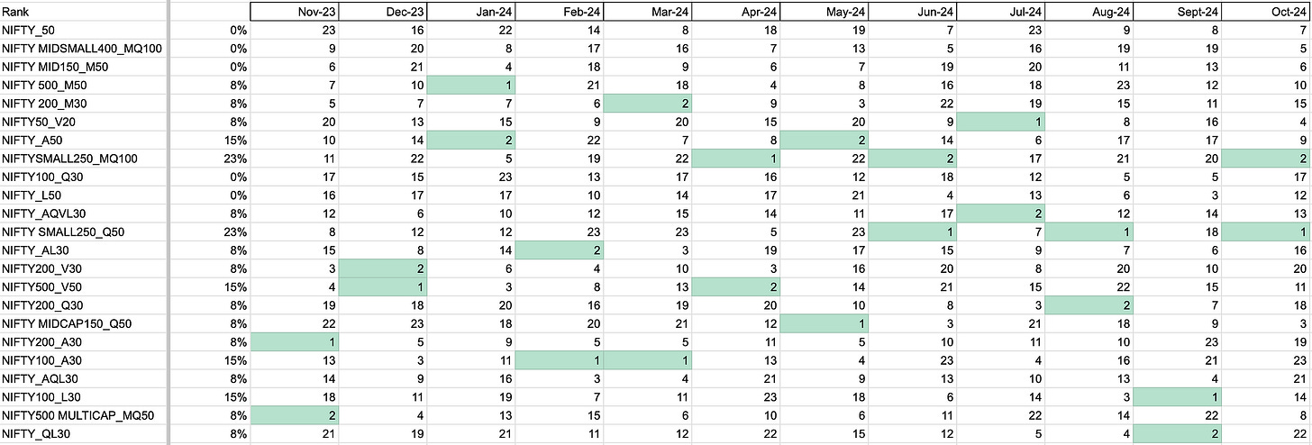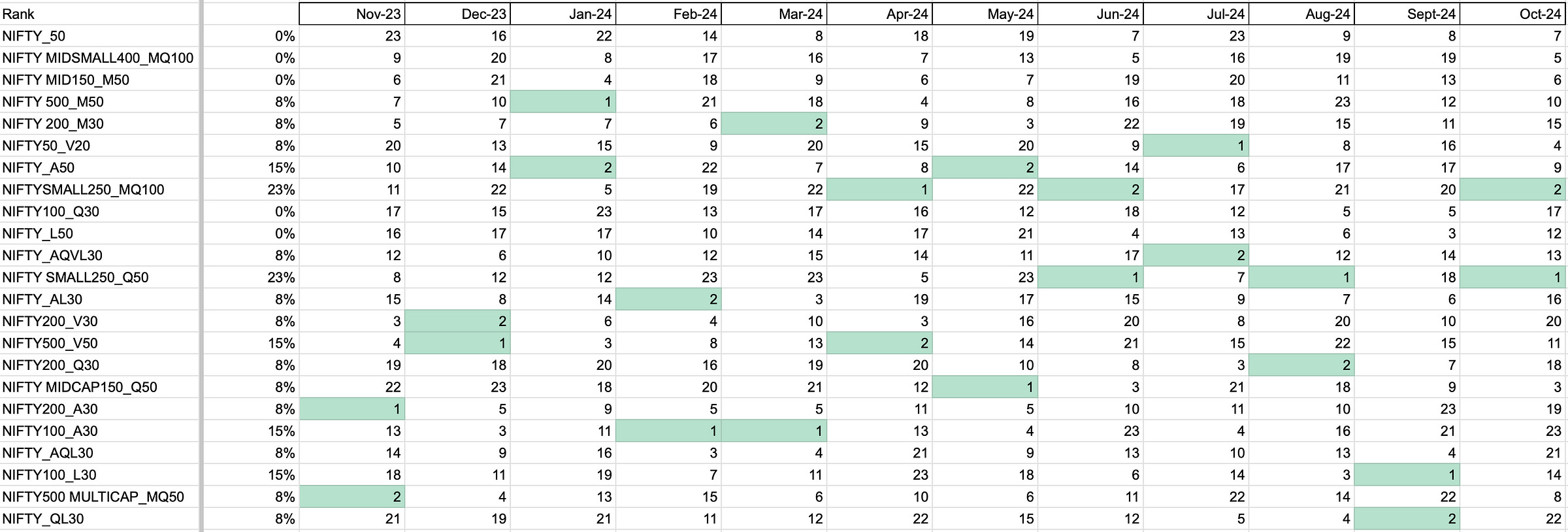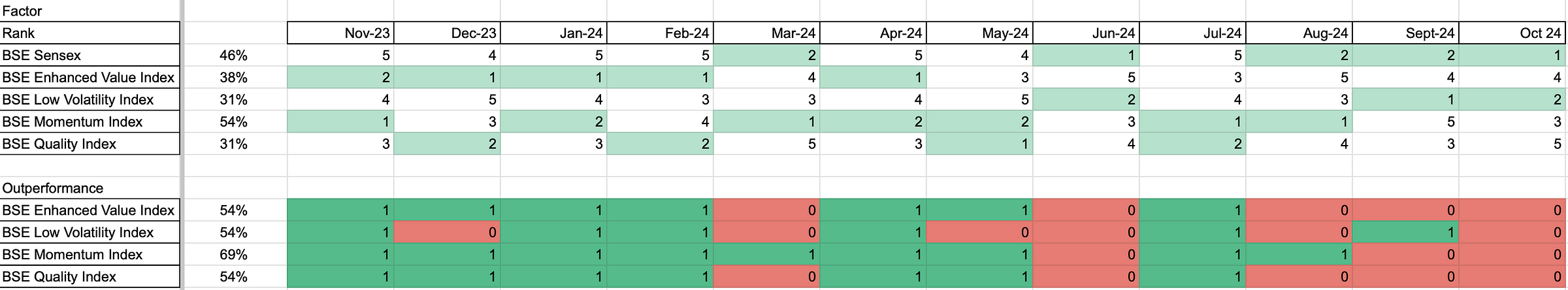 3. Ranking: The indices were ranked from highest to lowest based on their percentage returns for each month. This allowed us to identify the best-performing factors over time.