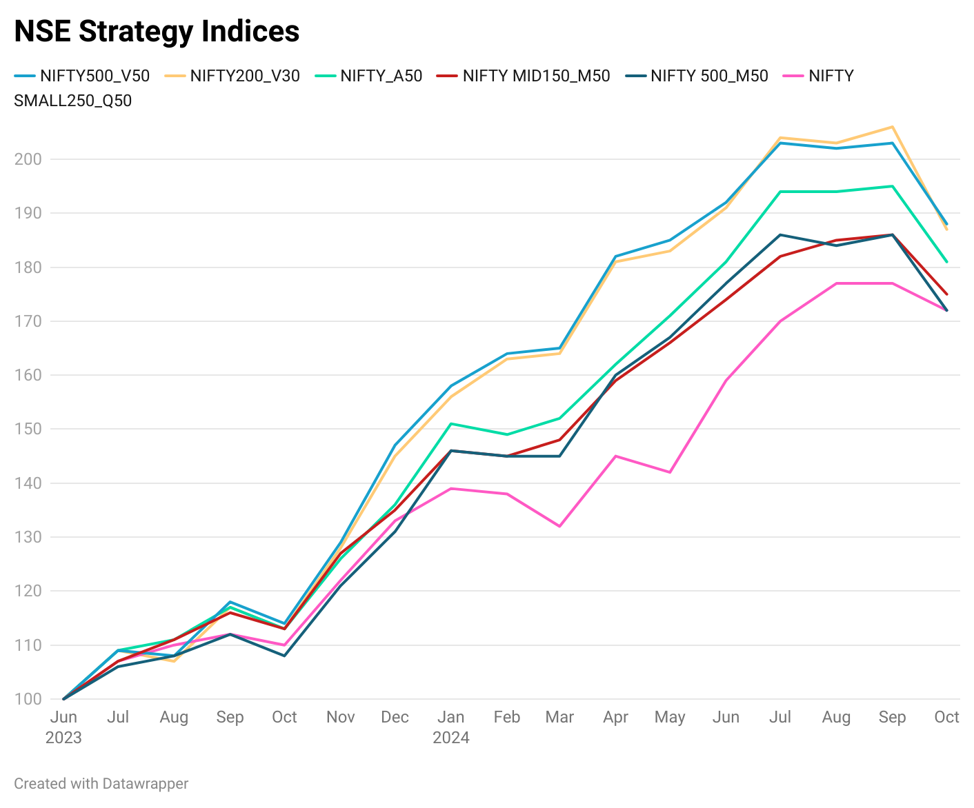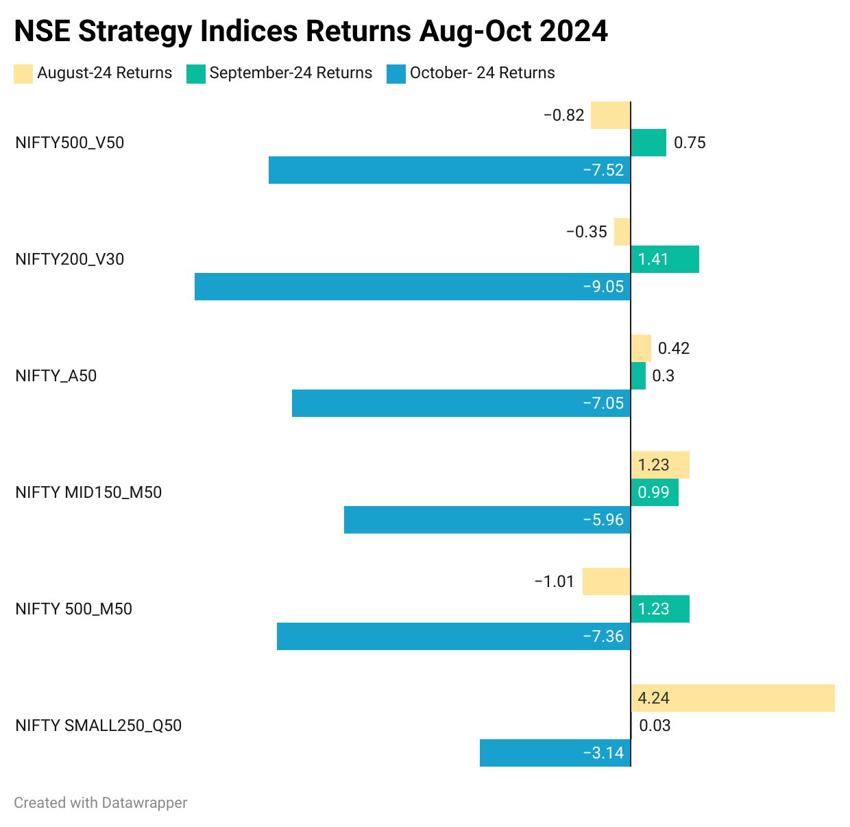 October showed broad decline: NIFTY200_V30 worst hit (-9.05%), while NIFTY SMALL250_Q50 fared best (-3.14%)